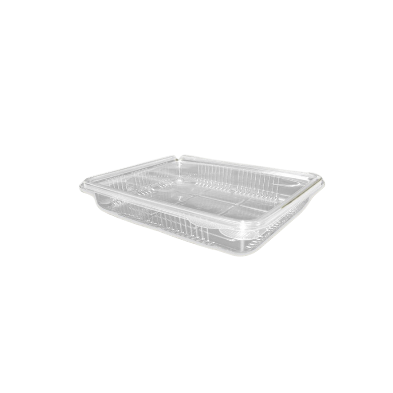 Tarrina Bisagra PET 2000CC Tapa Alta. Paquete 25 unidades. Caja 4 Paquetes.